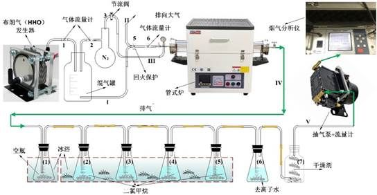 生物质热解作为一种生物质能高效利用技术,可以缓解我国不可再生能源的严重消耗问题。而焦油作为生物质热解过程的中间产物,其低温下易冷凝造成设备堵塞或腐蚀,降低了生物质热解效率。布朗气作为一种新型氢氧混合新能源气体,含有大量的-H-OH-O等活性自由基,可促进燃料中高碳氢链的裂解, 使氧化反应速度加快, 起到催化燃烧的效果。项目团队提出了在生物质热解过程中通入少量布朗气来促进生物质热解过程中焦油的裂解的新方法,设计了布朗气绿氢复合气-生物质热解焦油催化裂解固定床实验,分别探究了以下两个方面内容: